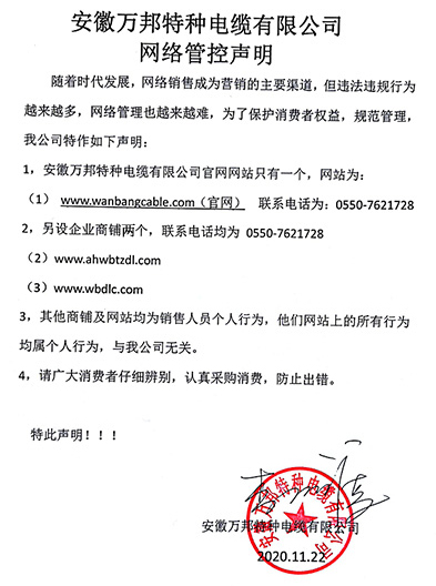鄭重聲明:安徽萬邦特種電纜有限公司官方網站為:www_wanbangcable_com.qdbyhf.cn,除此之外無任何子網站或合作網站,其余均為假冒偽劣。電話:0550-7621728 13485756353 地 址:安徽省天長市滁州高新技術產業開發區經四路29號